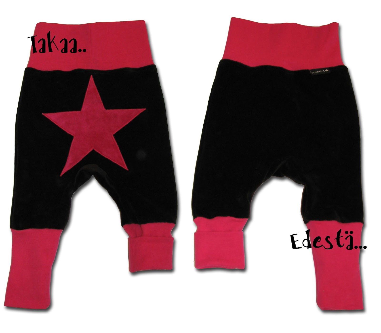 Tähti-peppu velourhousut. Asiakkaan kangasvalintojen mukaisesti vähän rockimmat pökät pikku-prinsessalle. :) Värit musta ja pinkki.